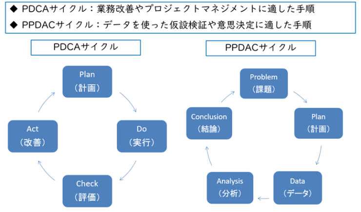 課題解決型マネジメントでは、改善のためのサイクルであるPDCAよりも、PPDAC(Problem → Plan → Data → Analysis → Conclusion)が適しています(図2参照)。PPDACは仮説をデータで検証するためのフレームです。